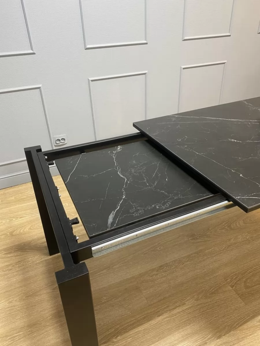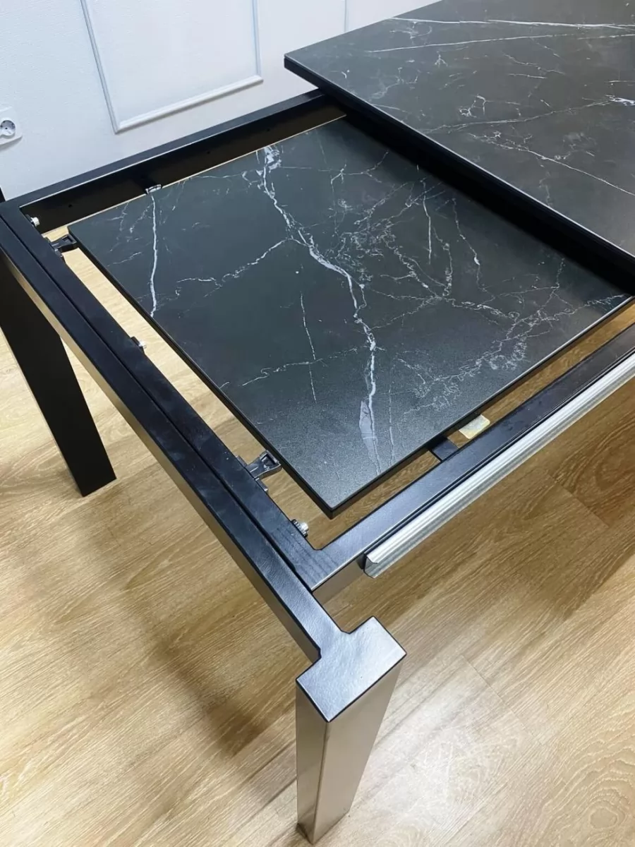 Стол KENNER BL1300 цвет черный, столешница - керамика чёрная. Один из самых удобных столов в ежедневном использовании. Столешница сплошная, без стыков. Опоры стоят максимально по краям - оставляют место под 2 больших стула или полукресла. Механизм "телескопического раздвижения", раскладка вместе с опорами. Даже в разложенном состоянии опоры остаются по краям, не мешают сидеть. Огромная вставка так же с керамикой! В разложенном виде стол вмещает по 4 стула с каждой широкой стороны.