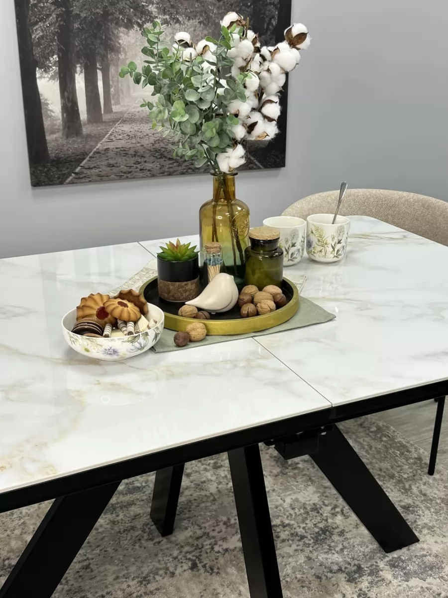 - Столешница премиум-класса. Керамика - наилучший и самый дорогой материал для обеденного стола. Она не портится от влаги, выдерживает температуру до 1000°С. Плотность керамики выше плотности металла и на ней не останутся следы от столовых приборов. Кроме того, это 100% натуральный материал в отличие от разного вида пластиков.