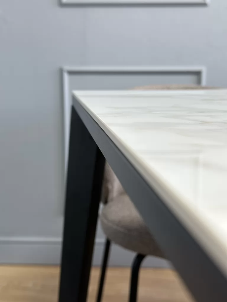 Столешница премиум-класса. Керамика - наилучший и самый дорогой материал для обеденного стола. Она не портится от влаги, выдерживает температуру до 1000°С. Плотность керамики выше плотности металла и на ней не останутся следы от столовых приборов. Кроме того, это 100% натуральный материал в отличие от разного вида пластиков.