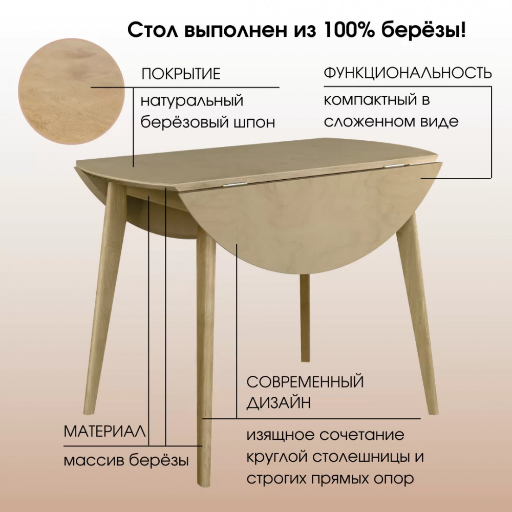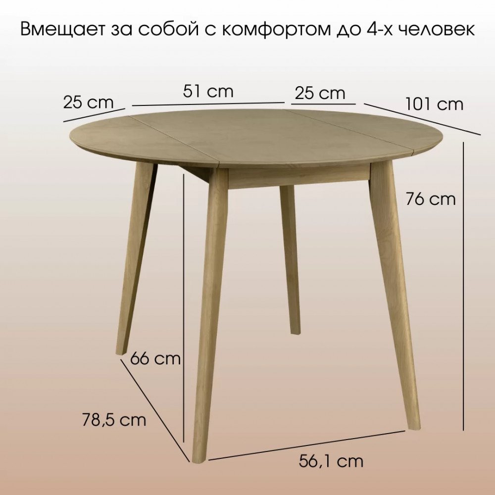 Компактный и стильный в сложенном виде он превращается в полноценный вместительный обеденный стол в разложенном состоянии, за которым с комфортом разместятся 4 человека.