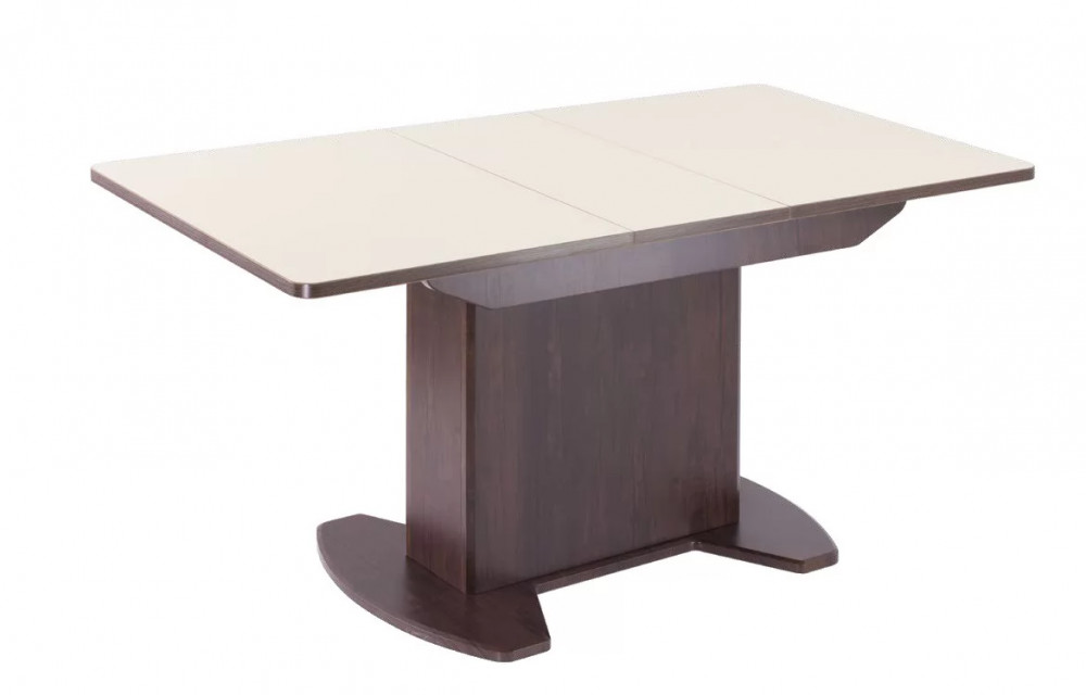 Стол (раздвижной) выполнен из ДСП 26мм МДФ в пленке ПВХ покрытый пластиком HPL, вставка 40 см хранится внутри стола. Стоит на опоре-колонне из МДФ с основанием эргономичной формы.