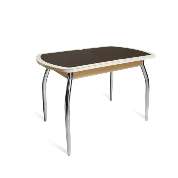Стол (НЕ раздвижной) выполнен из ЛДСП 22 мм, покрытого закаленным стеклом 4 мм с безопасной фаской, контур стекла выкрашен высококачественными эмалями, под стеклом - экокожа. В базовой комплектации опоры гнутые хром.