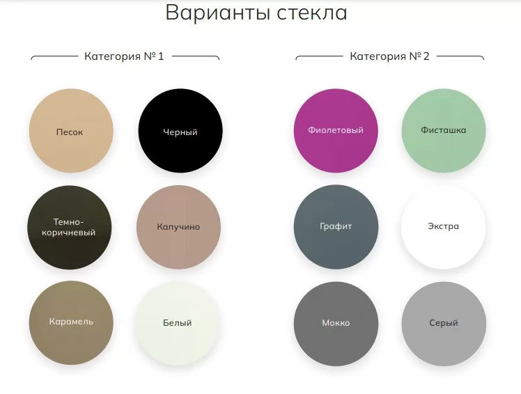 | Варианты стекла (Созвездие) | Экстра БЕЛОЕ, графит, мокко, фисташка, серое, тёмно-синее, алое, зеленое, фиолетовое, карамель, капучино, т.коричневое, бордовое, белое, черное, оранжевое, песочное |