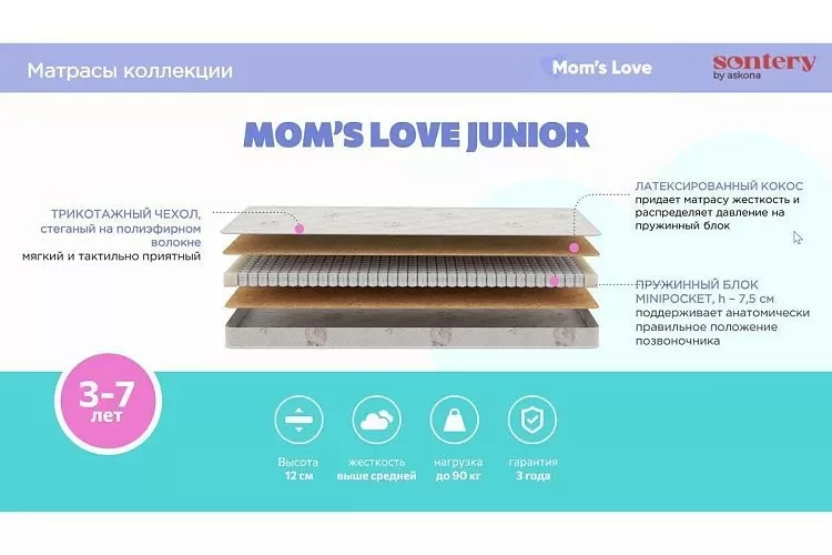 Матрас MOM'S LOVE Junior 700*1600мм (кокос, тритажный чехол, жесткий h 7,5см) в Тюмени