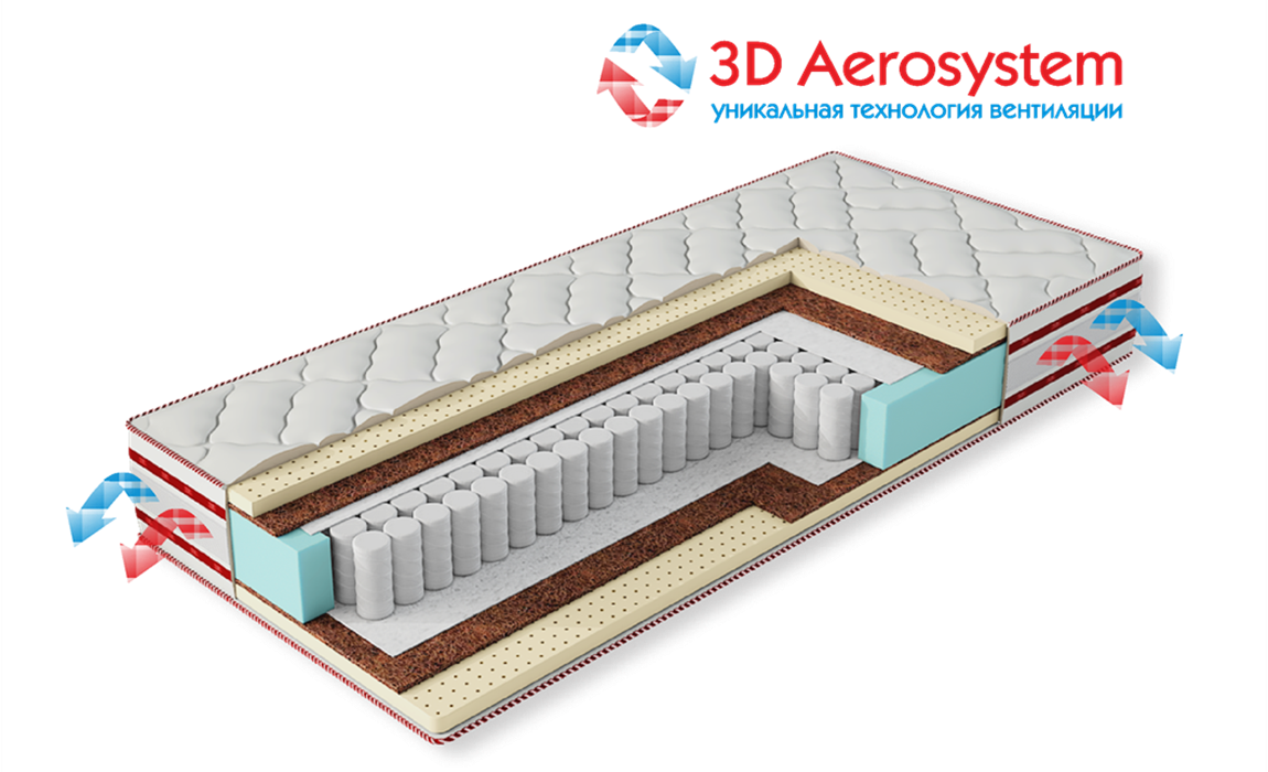 | 3D Aerosystem - Особенностью и уникальной частью конструкции является трехмерная аэролента, интегрированная в борт матраса по всему периметру. Аэролента не является токсичной, гипоаллергенной и достаточно гигиенична. |