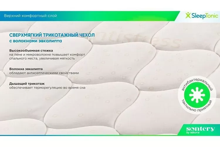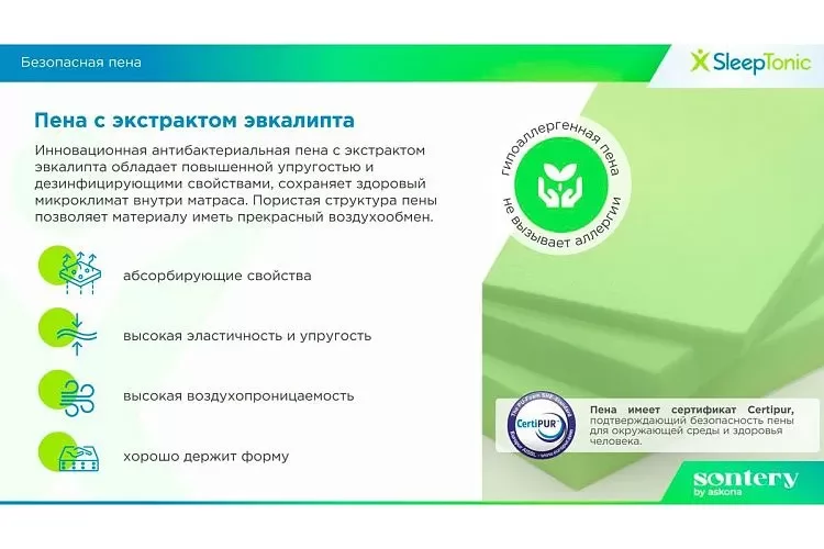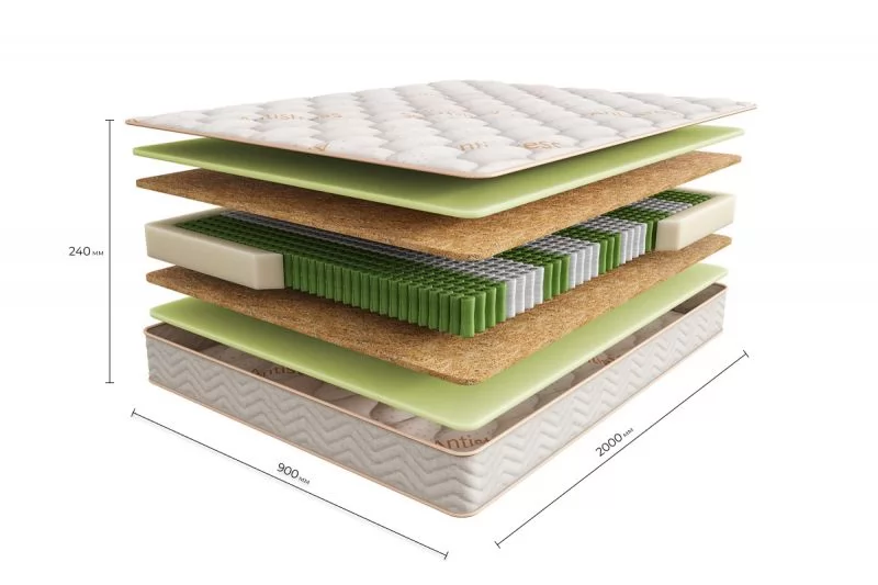 | Наполнение | Антибактериальная пена с экстрактом эвкалипта, Латексированная кокосовая койра, Независимый пружинный блок |