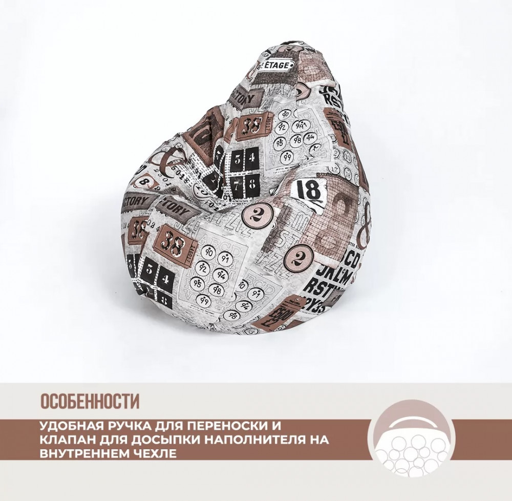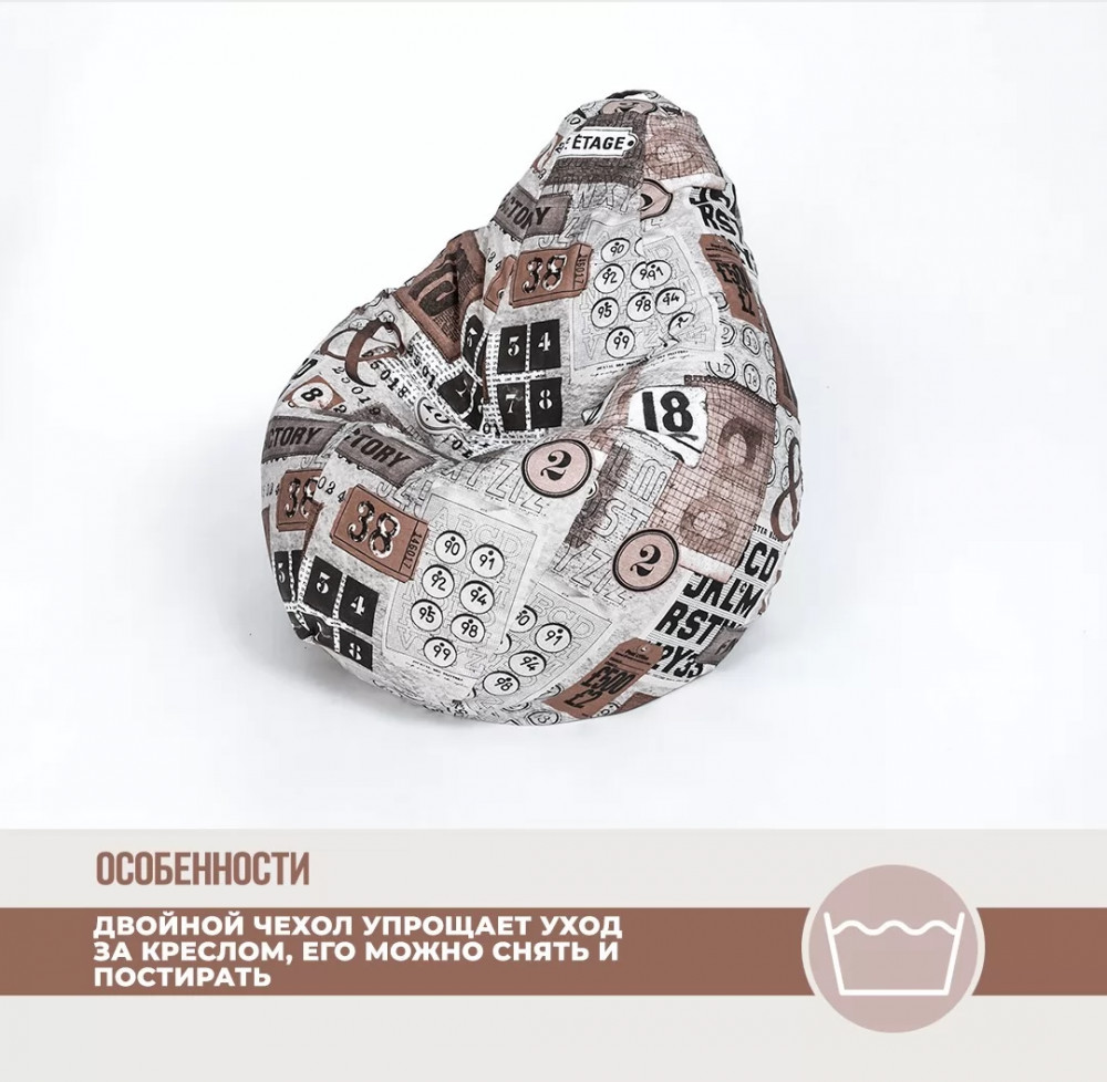 Верх изделия оснащен молнией, при помощи которой чехол снимается для влажной уборки пятен. Внутренний чехол выполнен из плотной нетканной ткани с клапаном для донасыпки наполнителя.