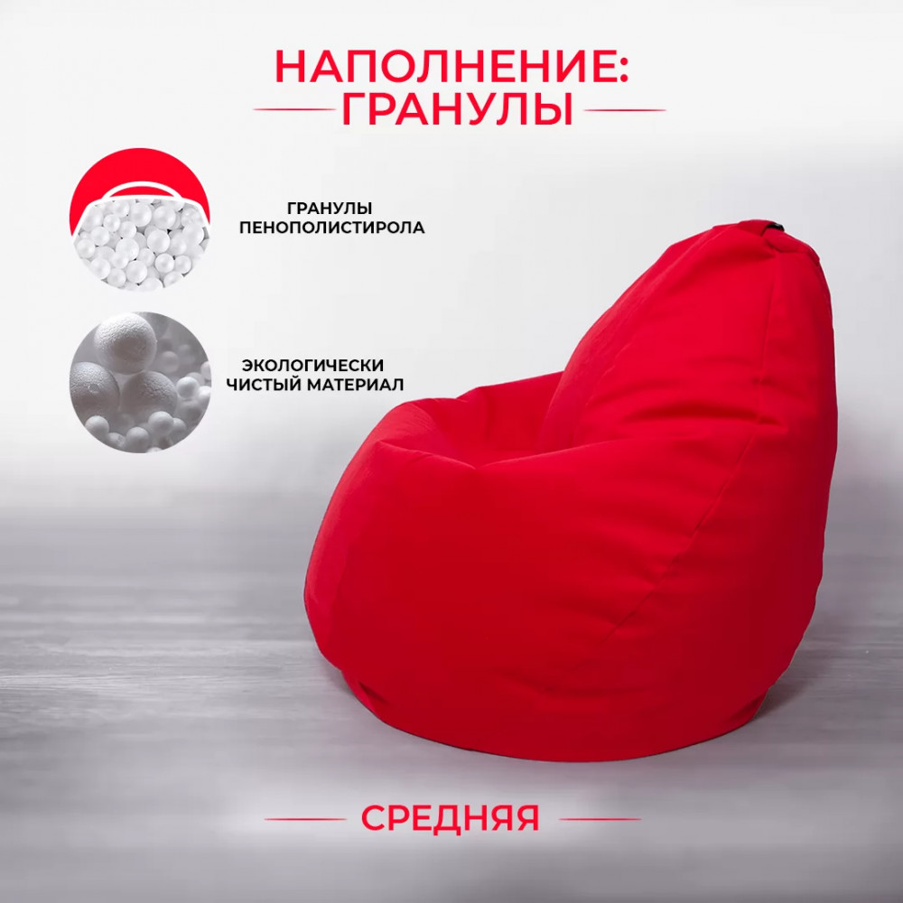 Наполнено гранулами шариками пенополистирола, которые при использовании кресла принимают форму и изгибы тела, за счет чего изделие очень удобное и расслабляет спину, снимает напряжение. Благодаря такому наполнителю изделие легкое и его может перемещать даже ребенок.