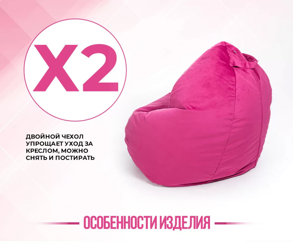 Верх изделия оснащен молнией, при помощи которой чехол снимается для влажной уборки пятен. Внутренний чехол выполнен из плотной нетканной ткани с клапаном для донасыпки наполнителя.