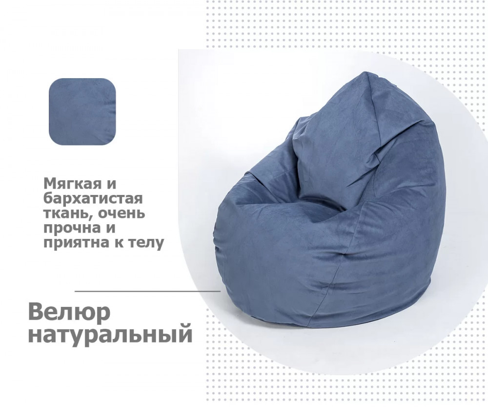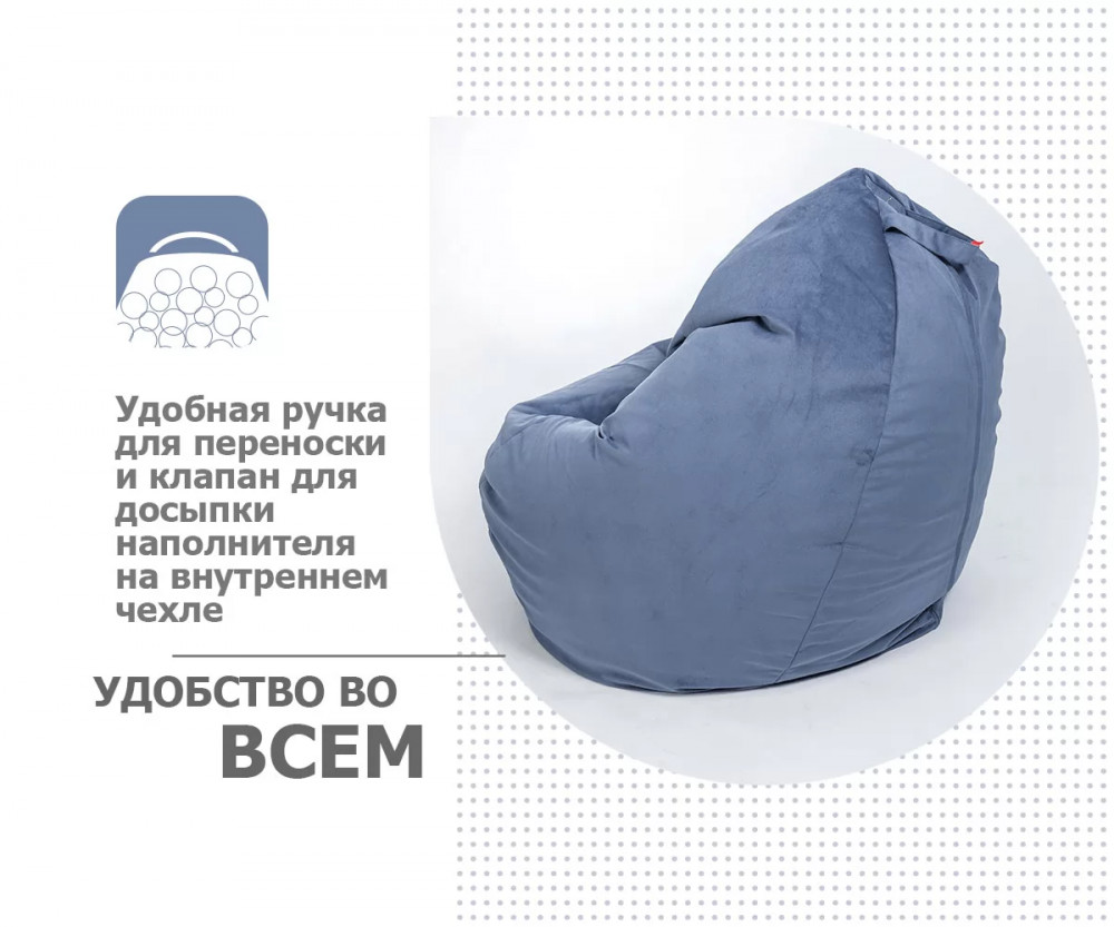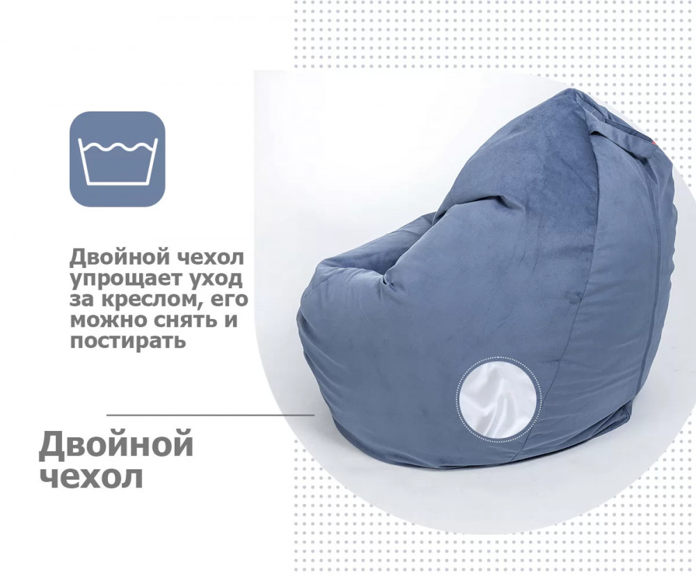 Двойной чехол упрощает уход за креслом, его можно снять и постирать. Удобная ручка для переноски и клапан для досыпки наполнителя на внутреннем чехле.