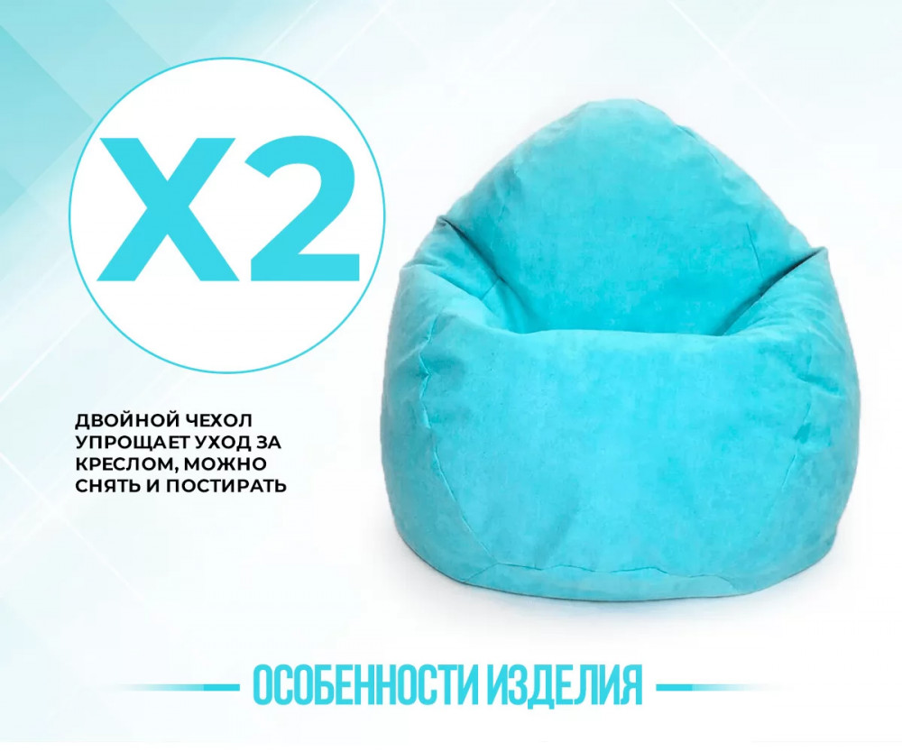 Двойной чехол упрощает уход за креслом, его можно снять и постирать. Удобная ручка для переноски и клапан для досыпки наполнителя на внутреннем чехле.