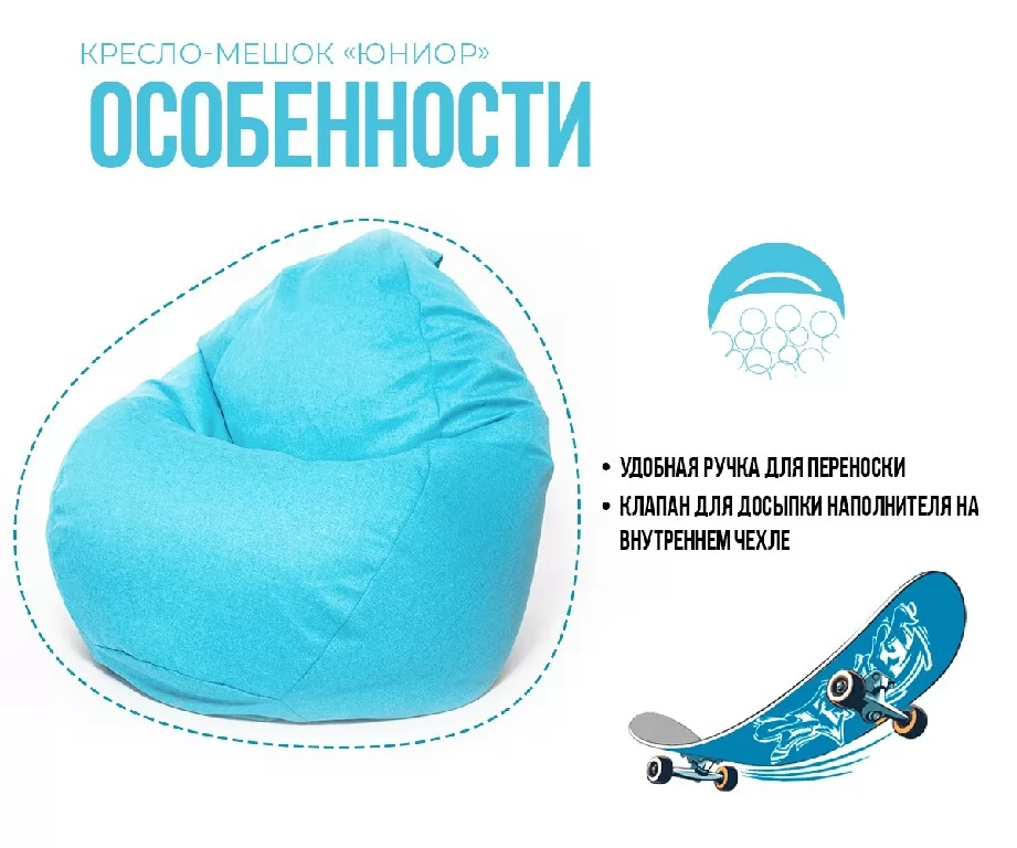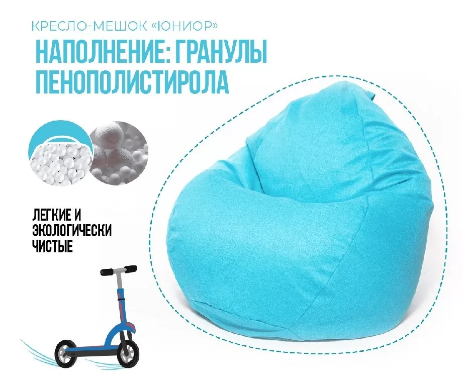 Наполнено гранулами шариками пенополистирола, которые при использовании кресла принимают форму и изгибы тела, засчет чего изделие очень удобное и расслабляет спину, снимает напряжение. Благодаря такому наполнителю изделие легкое и его может перемещать даже ребенок.