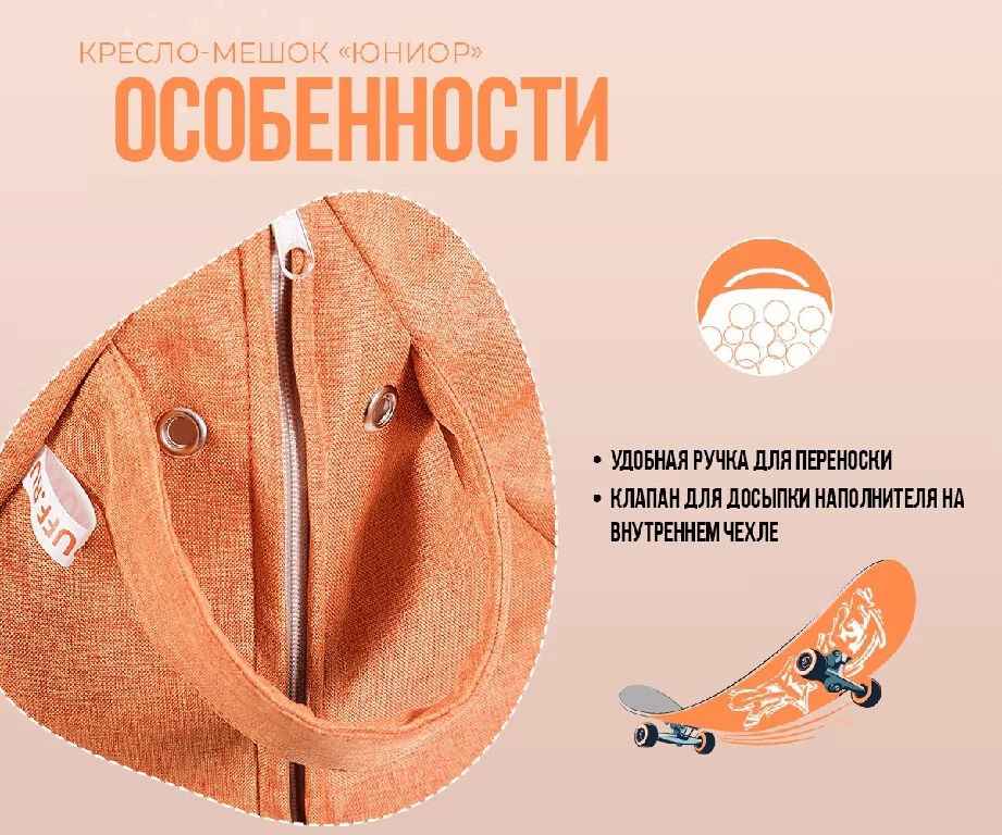 Наполнено гранулами шариками пенополистирола, которые при использовании кресла принимают форму и изгибы тела, засчет чего изделие очень удобное и расслабляет спину, снимает напряжение. Благодаря такому наполнителю изделие легкое и его может перемещать даже ребенок.