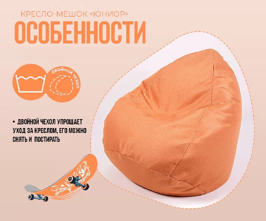 Верх изделия оснащен молнией, при помощи которой чехол снимается для влажной уборки пятен. Внутренний чехол выполнен из плотной нетканной ткани с клапаном для донасыпки наполнителя.