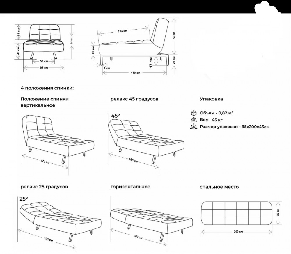 Кушетка Vita - изысканный предмет, который влюбляет в себя с первого взгляда. Она станет самым частым местом отдыха у всей семьи. Регулируемая спинка с 4 положениями, сиденье средней жёсткости и комфортная длина позволяют расправить спину, разгрузить позвоночник и вытянуть ноги для полноценного отдыха. Это прекрасное место для работы с ноутбуком, просмотра журналов или чтения книг. Встроенный механизм трансформации спинки турецкого производства. Он не только опускает и поднимает спинку в горизонтальное и вертикальное положения, но и позволяет устанавливать 2 положения релакс (45 и 25 градусов). Положения релакс – лучшее решение для отдыха в конце рабочего дня. На такой кушетке обязательно захочется отдохнуть, расслабится и набраться сил для новых целей. Кушетка Vita - это находка для будущих мам. Комфортное положение спинки снизит нагрузку на позвоночник при кормлении малыша, а удлинённое основание обеспечит отдых для ваших ножек, сохраняя здоровье и красоту. Оптимальная ширина кушетки вмещает маму с ребёнком, а также двух детей или влюблённых в крепких объятьях. Кушетка Vita , заменит не только обычное привычное многим кресло, но и станет комфортным спальным местом (95 х 200 см) для взрослого человека. С мебелью коллекции Vita вы забудете о передвижении мебели, во время уборки. Высота ножек у кушетки - 17 см. Проводить влажную уборку самостоятельно и при помощи робота-пылесоса станет намного проще. Неровность пола, стыки с ковровым покрытием вы легко отрегулируете подпятниками. Они же защитят напольное покрытие от повреждений. В своём интерьере вы сможете собрать всю коллекцию Vita , в которую входит: диван, кушетка, кресло и пуф. Модели можно комбинировать друг с другом по вашему желанию. Ткань обивка кушетки выполнена из мягкого, приятного и «дышащего» велюра с отсутствующим пальчиковым эффектом. Ткань износостойкая с влагоотталкивающей пропиткой – легко моется и быстро сохнет.
