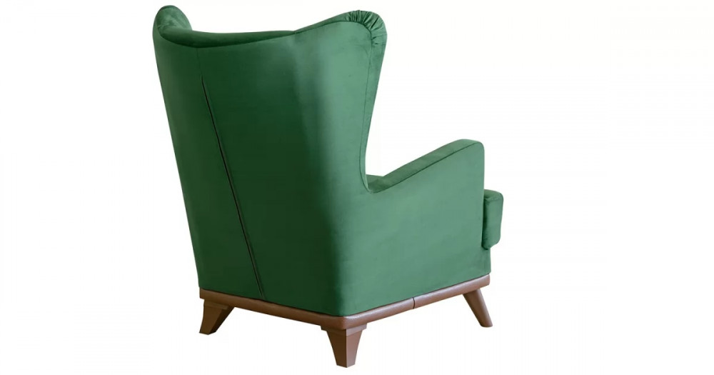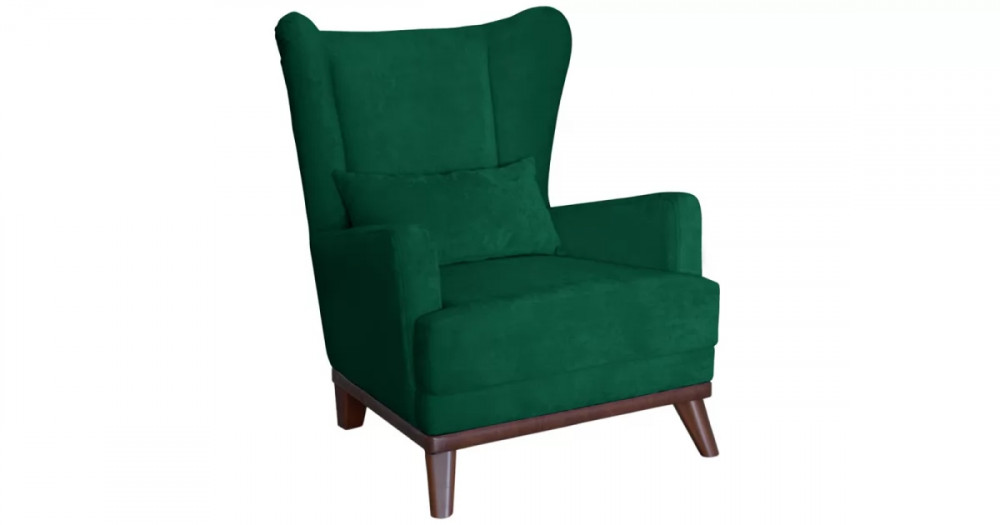 Высокая спинка с наклоном и мягкие подлокотники обеспечивают удобную посадку, дополнительный комфорт создает декоративная подушка. Царга кресла обтянута искусственной кожей в цвет опорам.