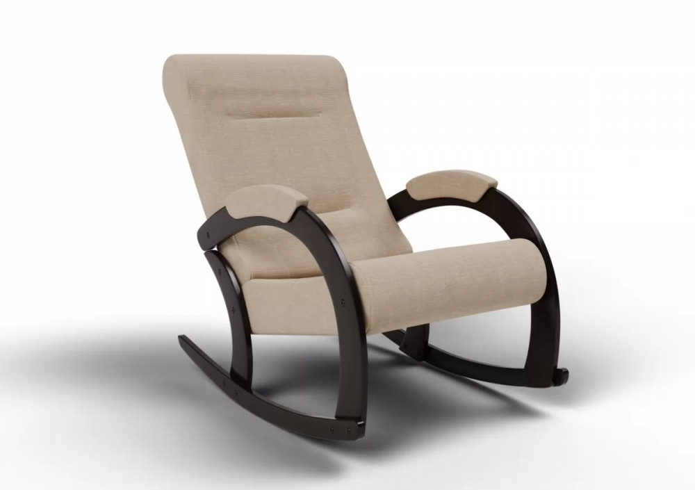 Кресло обтянуто мебельной тканью, каркас-дерево, боковины выполнены с небольшими закруглениями полозьев, чем обеспечивает умеренным покачиванием и абсолютной устойчивостью, материал боковины фанера. На боковинах имеются мягкие подлокотники.