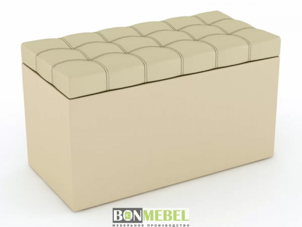 Внутренний каркас сделан из ДСП, обивка — искусственная кожа. Крышка оформлена двойной строчкой.