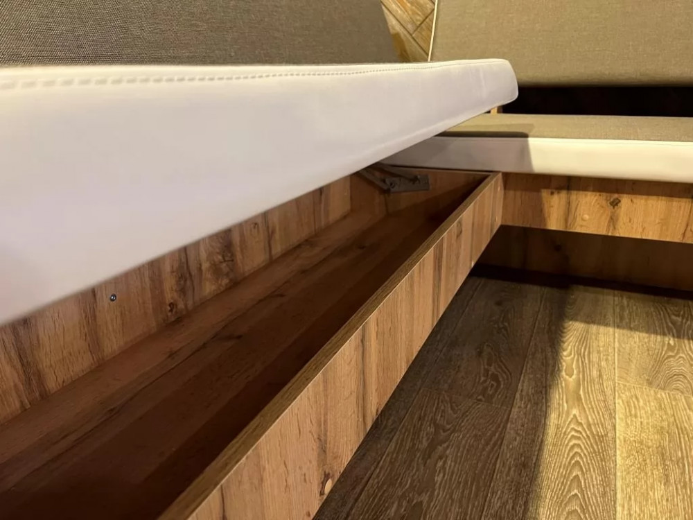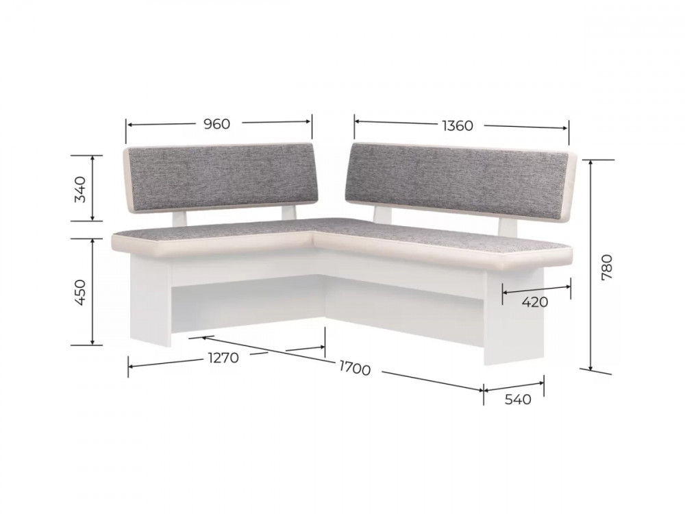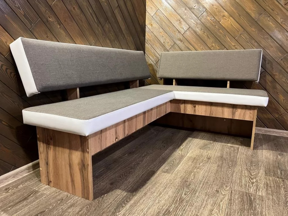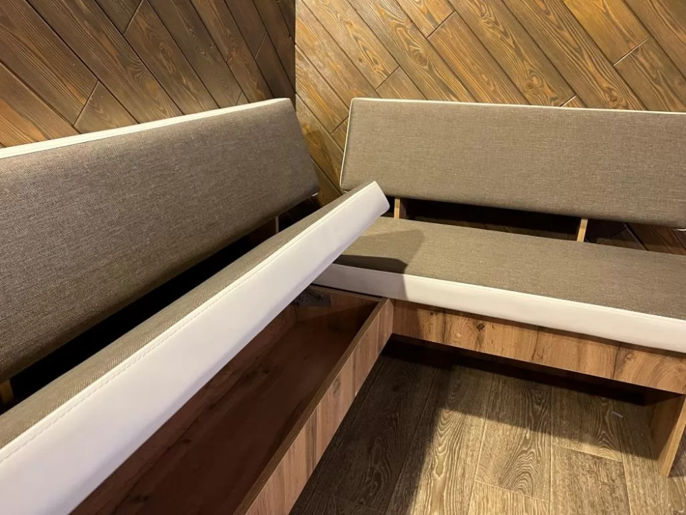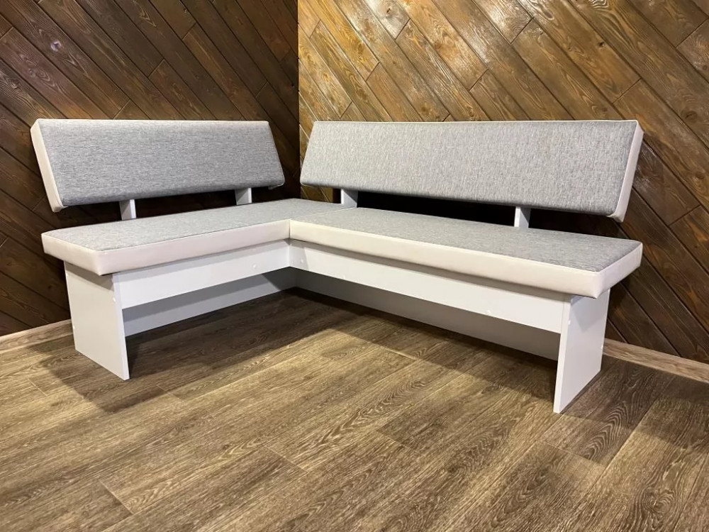 Удобный и компактный кухонный уголок с современным дизайном. Износоустойчивый материал обивки. Сборка на ваш выбор — левая/правая. Наличие ящика для хранения различных кухонных вещей.