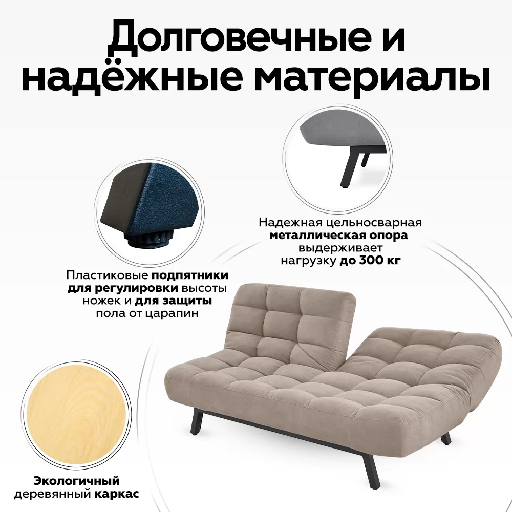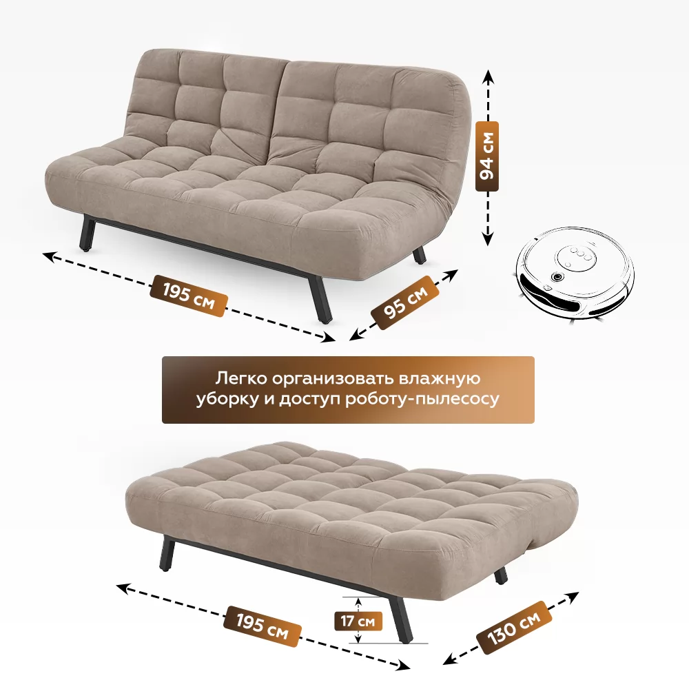 С диваном Vita вы сможете забыть о передвижении мебели, во время уборки. Высота ножек 17 см позволяет с легкость проводить как влажную уборку, так и обеспечивать комфортную работу роботу-пылесосу. Неровность пола, стыки с ковровым покрытием вы легко отрегулируете подпятниками дивана. А также они сохранят напольное покрытие от повреждений.