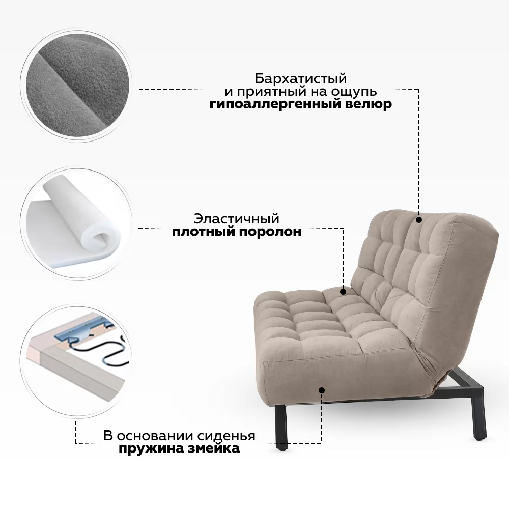 Мягкая, бархатистая ткань создает ощущение теплых объятий и нежно прикасается к телу. ПРУЖИННЫЙ МЕХАНИЗМ змейка поддерживает положение тела, создает опору для вашего позвоночника и служит прочной основой дивана. Обивка дивана выполнена из мягкого, приятного и «дышащего» велюра с отсутствующим пальчиковым эффектом. Ткань износостойкая с влагоотталкивающей пропиткой.