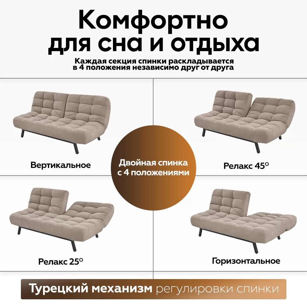 ДВОЙНАЯ СПИНКА дивана, позволяет индивидуально регулировать наклон, а прочный турецкий механизм обеспечивает его долговечность. Встроенный механизм позволяет трансформировать диван в ЧЕТЫРЕ ПОЛОЖЕНИЯ: классический диван, полноценная кровать и 2 положения релакс с наклоном спинки 45͒ и 25͒. Вы сможете вдвоем читать книгу, смотреть фильм или отдыхать после рабочего дня в удобном для каждого из вас положении.