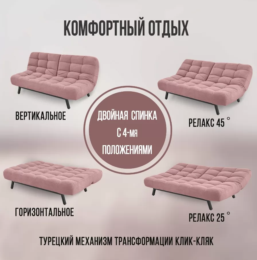 ДВОЙНАЯ СПИНКА дивана, позволяет индивидуально регулировать наклон, а прочный турецкий механизм обеспечивает его долговечность. Встроенный механизм позволяет трансформировать диван в ЧЕТЫРЕ ПОЛОЖЕНИЯ: классический диван, полноценная кровать и 2 положения релакс с наклоном спинки 45͒ и 25͒. Вы сможете вдвоем читать книгу, смотреть фильм или отдыхать после рабочего дня в удобном для каждого из вас положении.