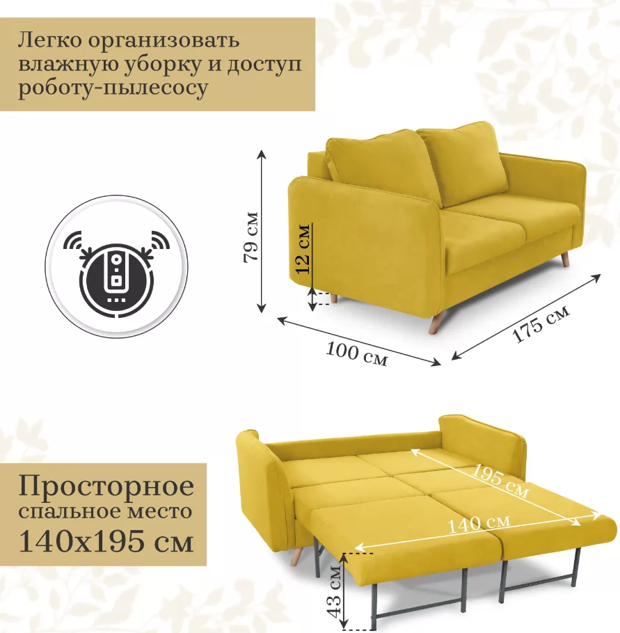 Узкие подлокотники дивана, зрительно подчёркивают его элегантность и экономят пространство. Высокие деревянные ножки 12 см, с подпятниками из войлока обеспечивают защиту напольного покрытия и удобство для уборки роботу пылесосу.