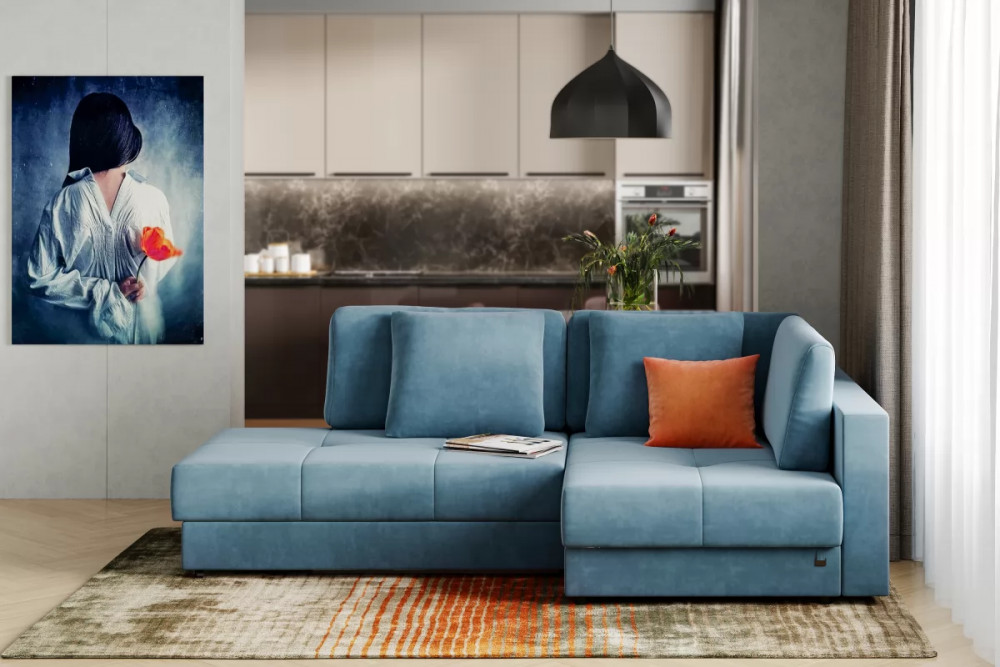 Шикарный диван для домашнего отдыха и большой компании. Идеальное решения для различных стилей: скандинавский, минимализм, лофт, современный. Наличие подспинных подушек обеспечивает поистине комфортный отдых, с их помощью можно регулировать глубину посадочного места. Полный угол позволит полностью заполнить свободное пространство и максимально его использовать. Главной отличительной особенностью является длина матрасов. Она одинаковая. По принципу работы диван напоминает ножницы. Удобство использования дивана заключается в поворотном механизме трансформации. Диван очень просто раскладывается и принимает исходное положение, выкатной механизм не требует значительных усилий при трансформации. Для создания спального места необходимо повернуть сиденье на 90 градусов и зафиксировать его крючком, находящимся под козырьком сиденья.
