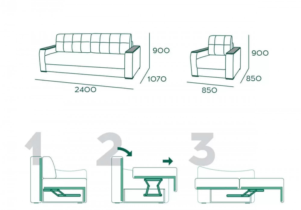 - Высота посадочного места: диван: 470 мм; кресло: 450 мм.
