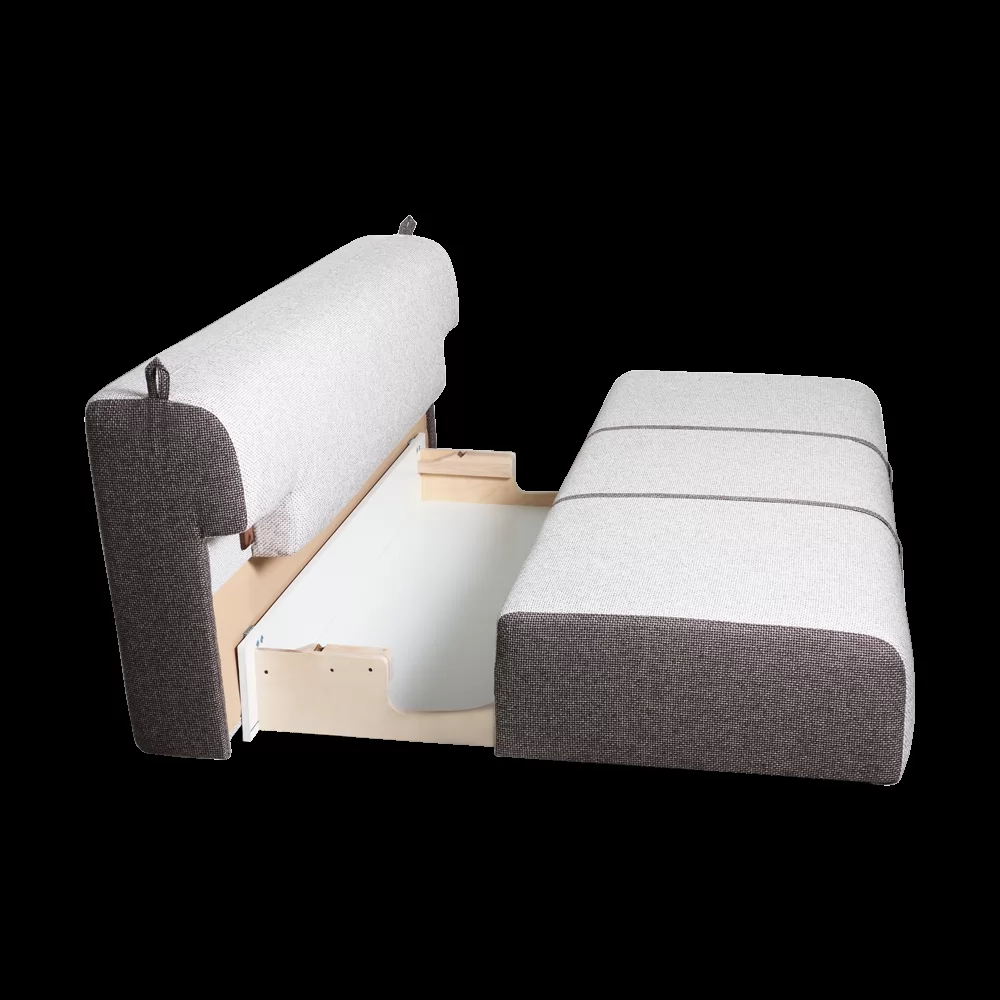 Наполнитель подушек-подлокотников эластичный ППУ. Чехлы на подушках съемные на молниях. Механизм трансформации Еврокнижка — выкатной на роликах по направляющим.