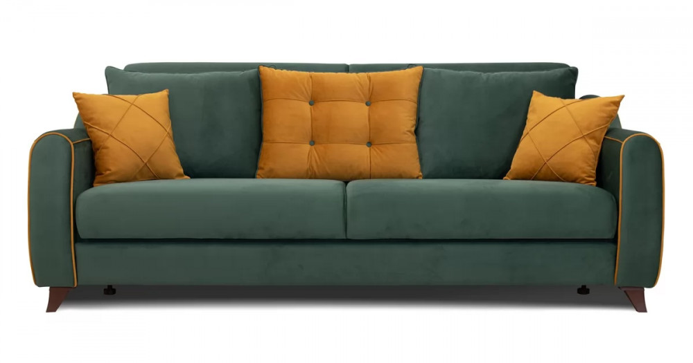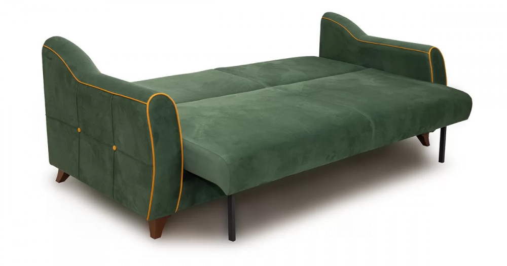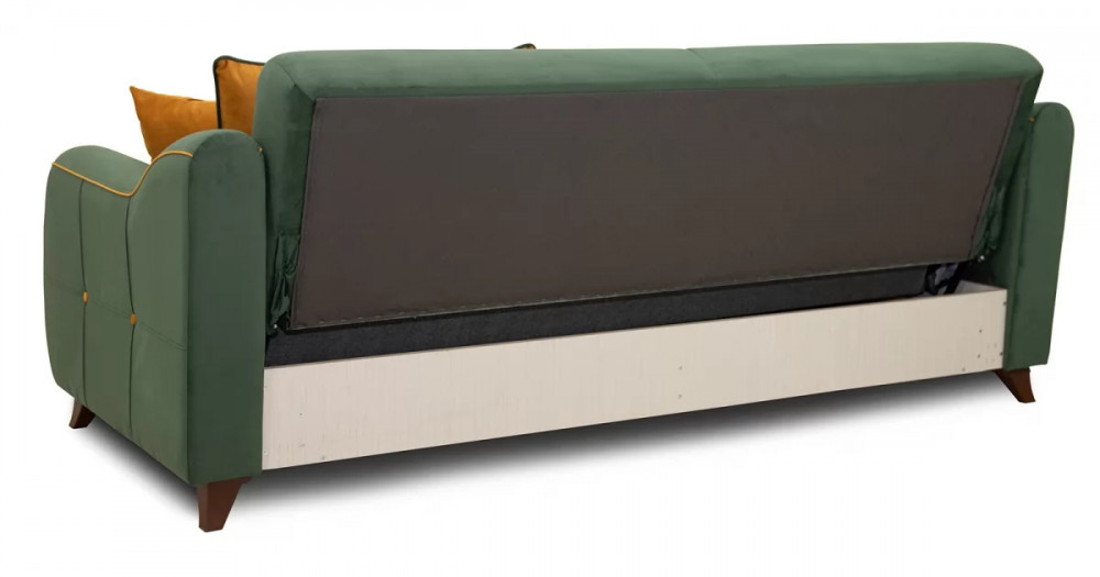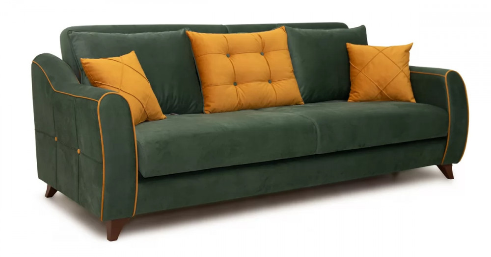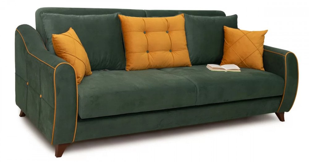 Габаритысложенный (Д x Г х В, мм): 2280 x 1030 x 900спальное место (Д x Ш, мм): 1950 x 1310высота посадки (мм): 480глубина сиденья (мм): 570максимально допустимая нагрузка: 80 кг на одно посадочное место, 100 кг на одно спальное местоМеханизм трансформацииКнижка с 0 стенойБельевой ящикестьс перегородкой по центру (2 отделения)размер отделения (Д x Ш, мм): 890 x 840 x 200Варианты исполнения5 артикуловсочетание тканей только как на фотоМатериалыосновная ткань: Амиго (велюр)выполняется в тканях: Амиго грин (нефритовый зеленый), Амиго йеллоу (золотистый желтый)каркас: фанера