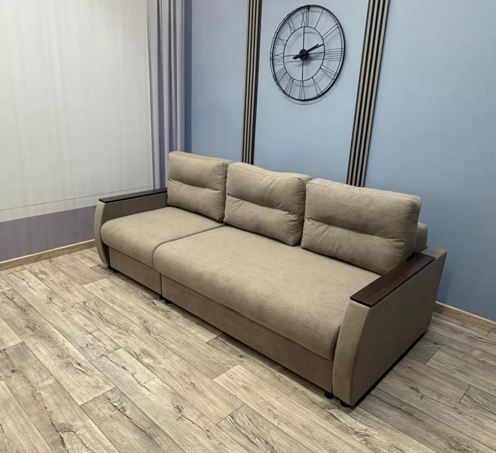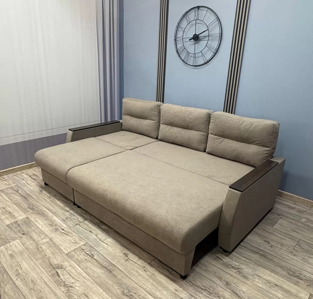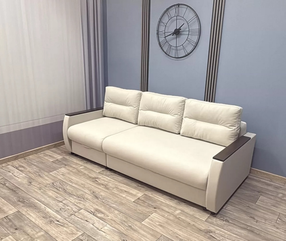Прекрасное сочетание элегантности и изящества. Подлокотники с декоративными накладками делают его безупречным для любого интерьерного решения. Главная особенность этой модели заключается в том, что из сложенного варианта диван легким движением превращается в угловой. Данная модель имеет универсальный угол. Механизм трансформации Пантограф (тик-так) позволяет без особых усилий формировать ровное спальное место. Так же имеется два вместительных короба для постельных принадлежностей.