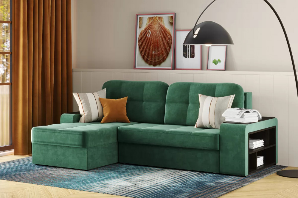 Диван-кровать угловой Дубай стильный и комфортный предмет для зоны отдыха в гостиной комнате. Модель выделяется оригинальным дизайном и качественным изготовлением. Диван Версаль имеет удобный механизм складывания "Еврокнижка". Сиденье дивана выдвигается, а спинка опускается вперед, образуя ровное место для сна. Такой диван не составит труда сложить и разложить каждый вечер и утро.Боковины оснащены декоративными накладками, которые обеспечивают дополнительную рабочую поверхность. В одну из боковин интегрирована полка для хранения книг,журналов, гаджетов.