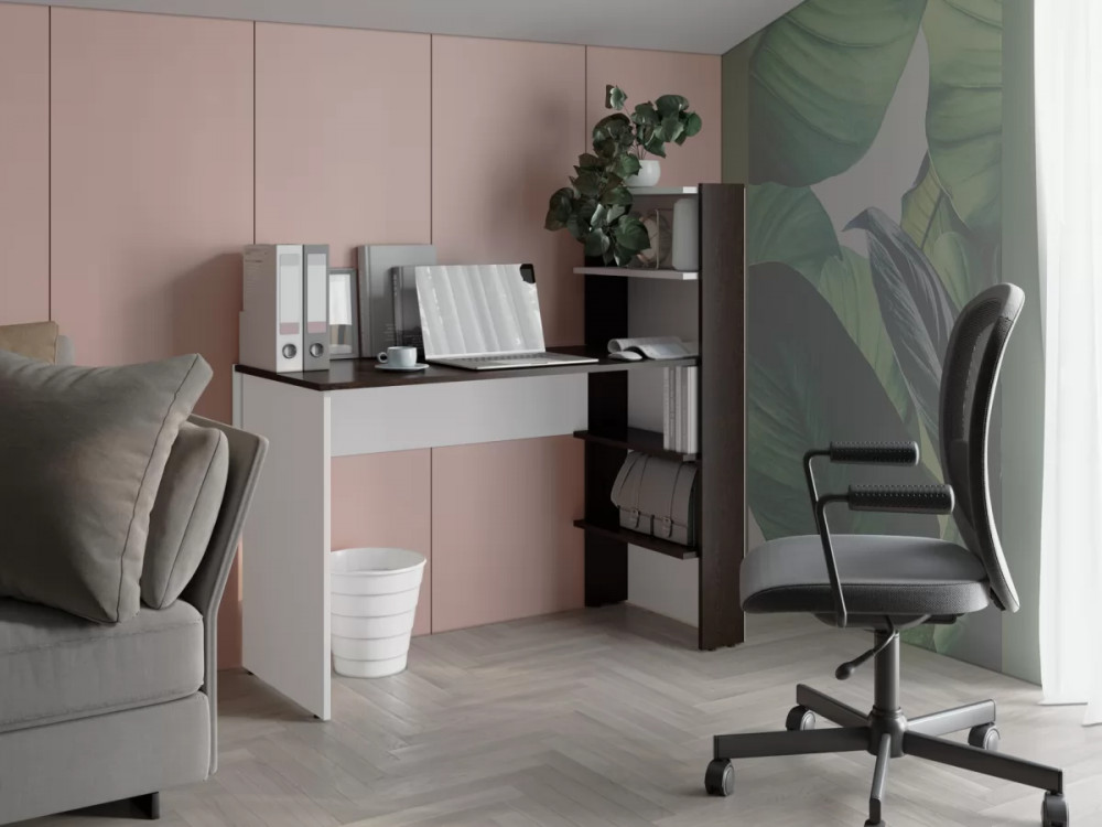 Компьютерный стол совмещает в себе удобство стола и мини стеллажа. Подходит для маленьких помещений.