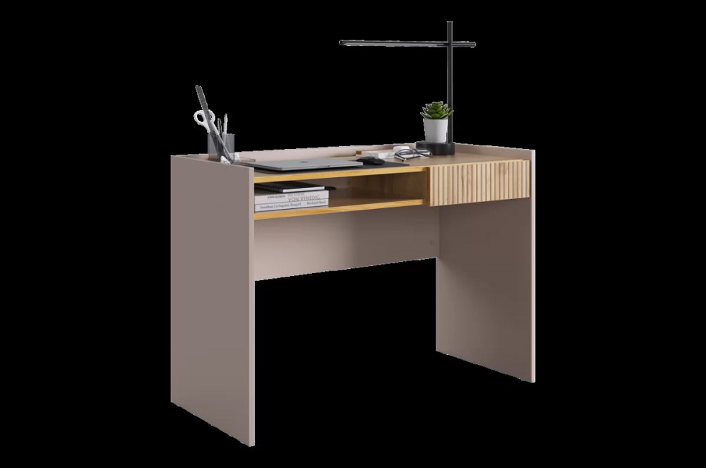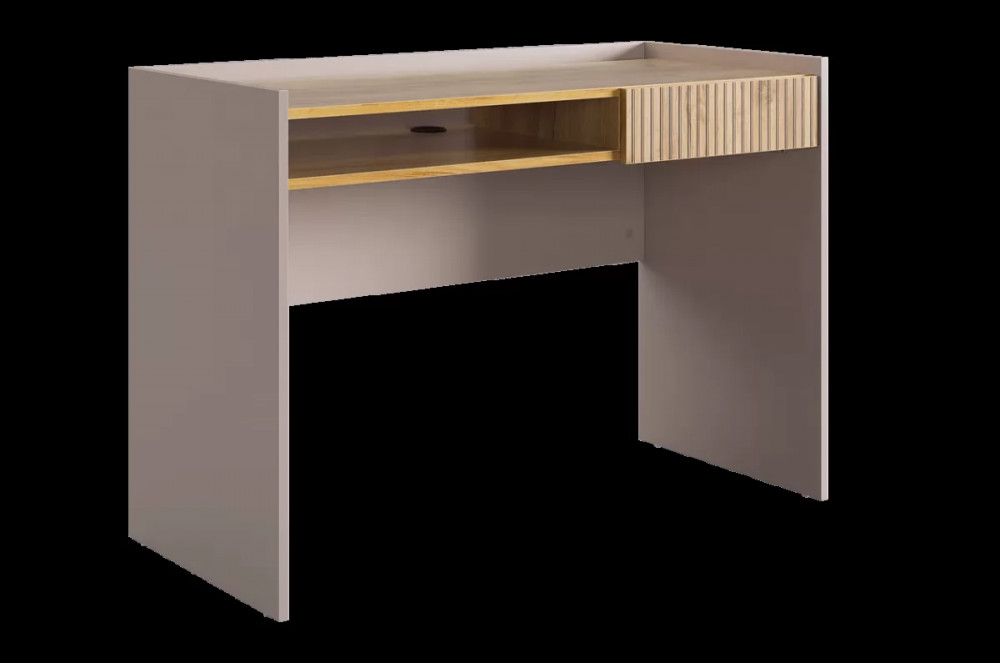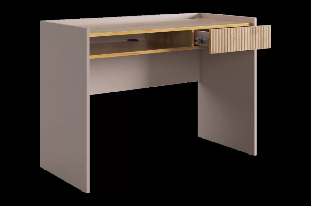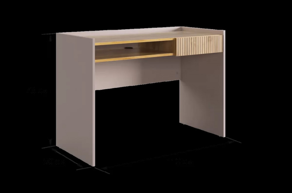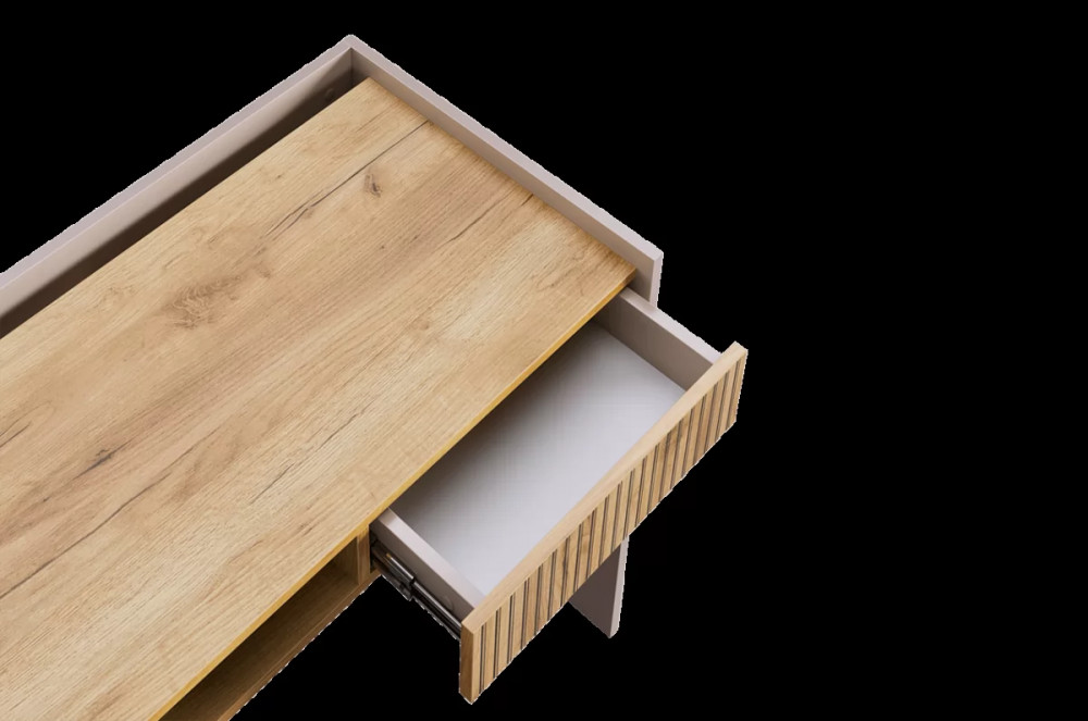 Корпус стола выполнен в цвете кашемир, что придает ему современный и спокойный вид, легко сочетающийся с любым интерьером. Выкатной ящик в цвете "дуб крафт золотой", декорирован принтом, имитирующим вертикальную фрезеровку, что добавляет столу уникальности и роскоши.