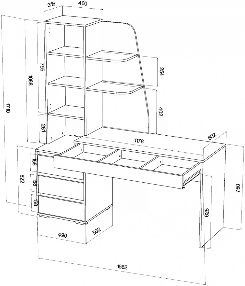 - Три ящика в тумбе + Один широкий ящик под столешницей.