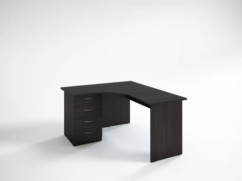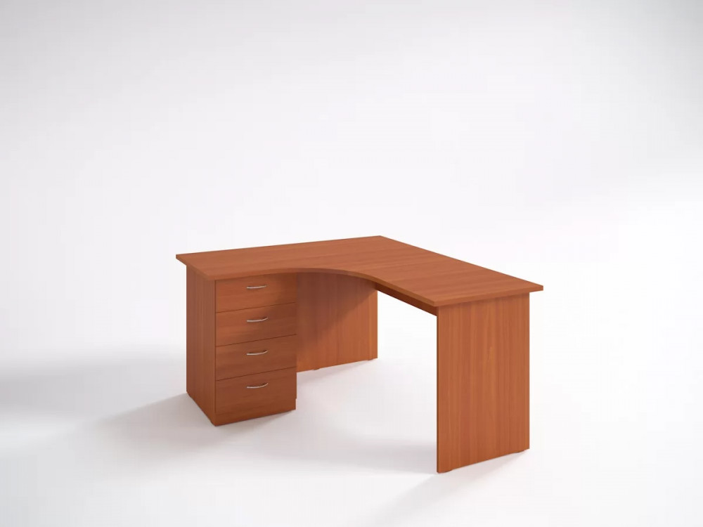 Угловые офисные столы удобны большой площадью столешниц, на которых помещается не только компьютер, но и органайзеры с документами. Данная модель дополнена ящиками на роликовых направляющих. Они легко открываются с помощью хромированных ручек-скобок, отполированных до блеска. Верхний ящик дополнен замком.