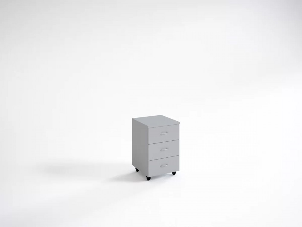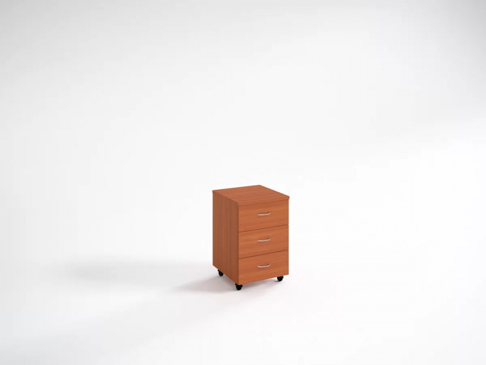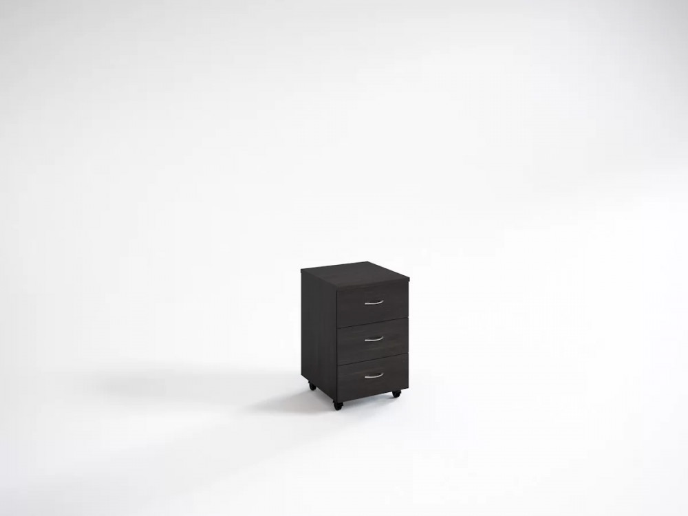 Офисные столы Кономи можно дополнить стационарными и мобильными тумбами того же дизайна. Данный вариант поставлен на колеса и ускоряет процесс уборки. Три ящика открываются с помощью ручек-скоб (полированный хром) и роликовых направляющих.