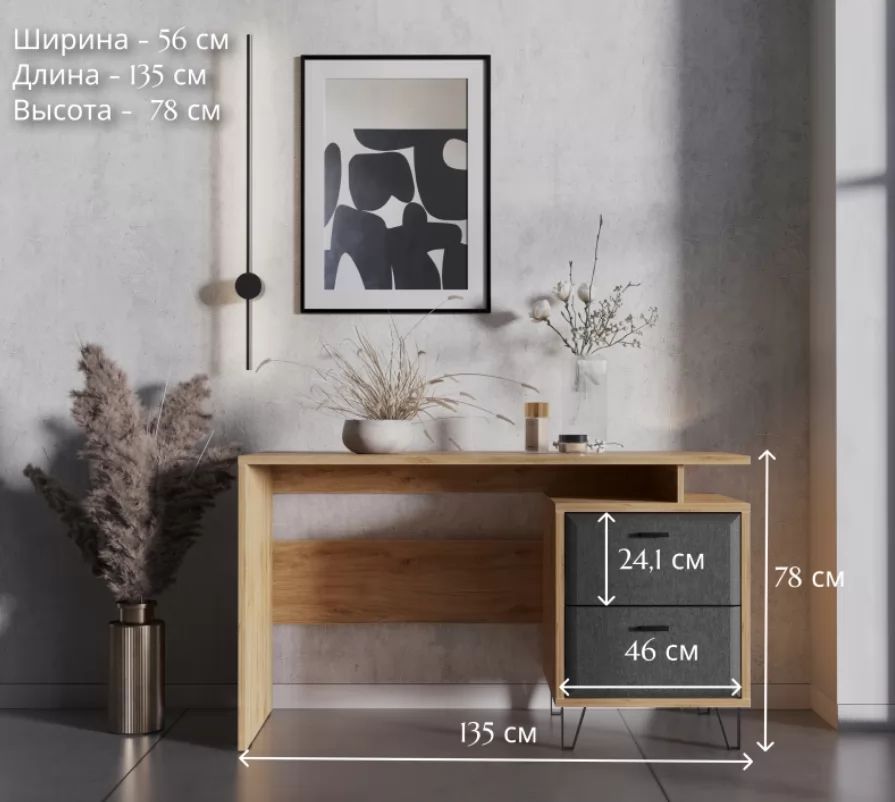 Стол стоит на металлических ножках, что гарантирует устойчивость конструкции. Лаконичный фасад ящиков и металлические ручки сделают эту часть интерьера центральным элементом комнаты.