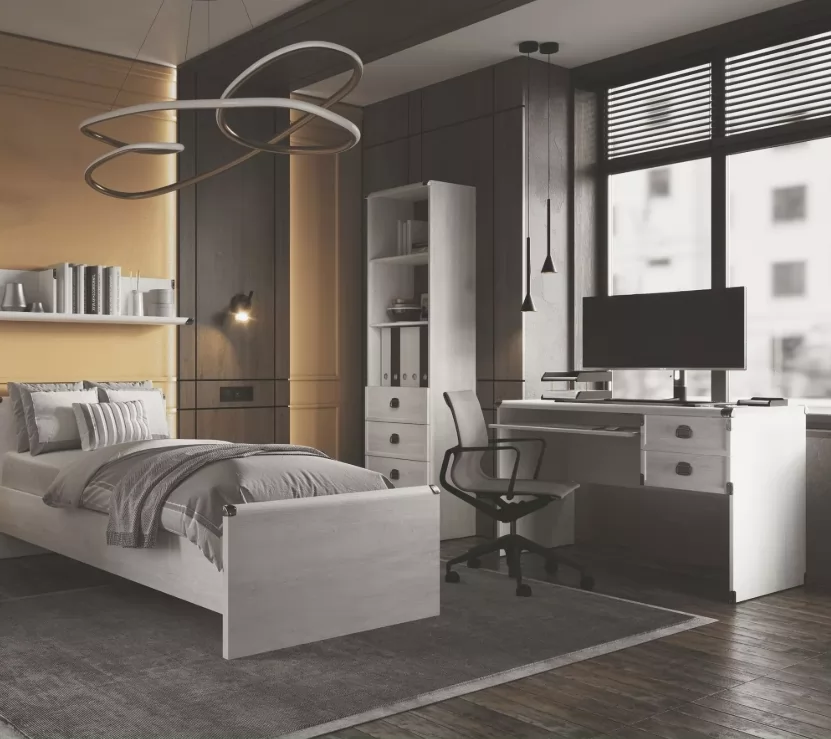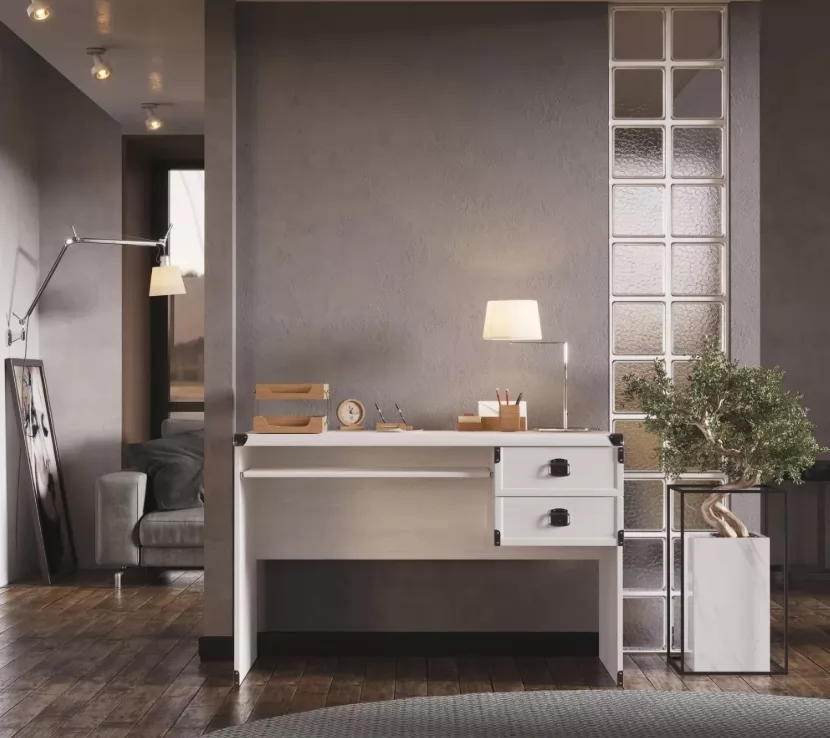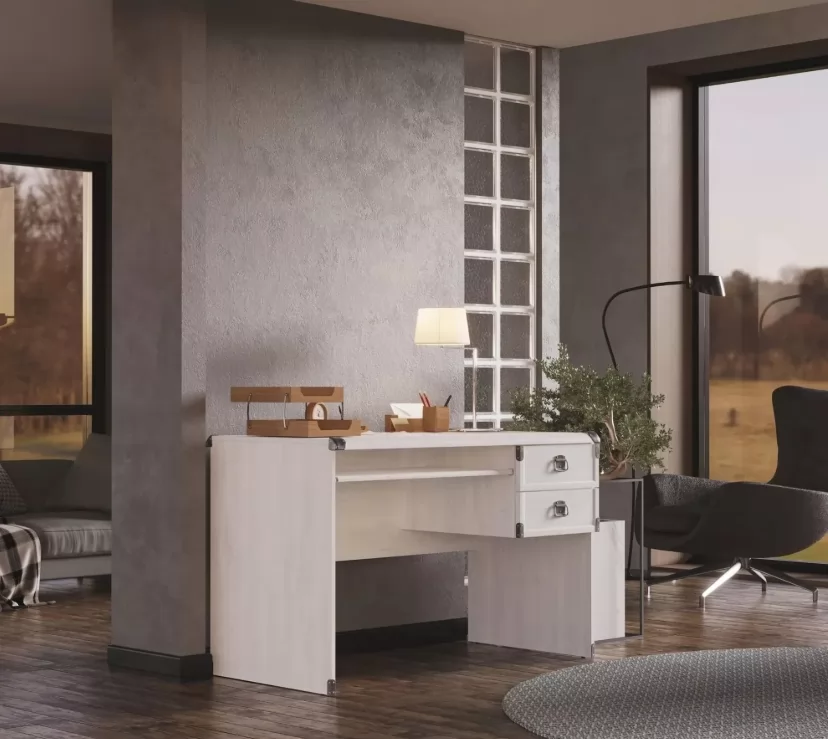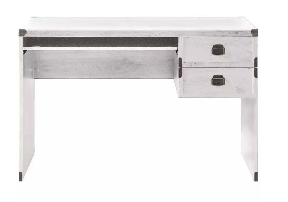 Стол выполнен в цвете сосна каньон — мягкие песочные оттенки с выразительной текстурой древесины, имитирующей состаренное дерево. Металлические накладки на углах, напоминающие ковку, и ручки в виде пиратских сундуков придают модели колоритный шарм. Лаконичные формы сочетаются с винтажными элементами, создавая баланс между брутальностью и элегантностью. Такой стол станет изюминкой детской, подростковой комнаты или домашнего кабинета в стиле кантри.