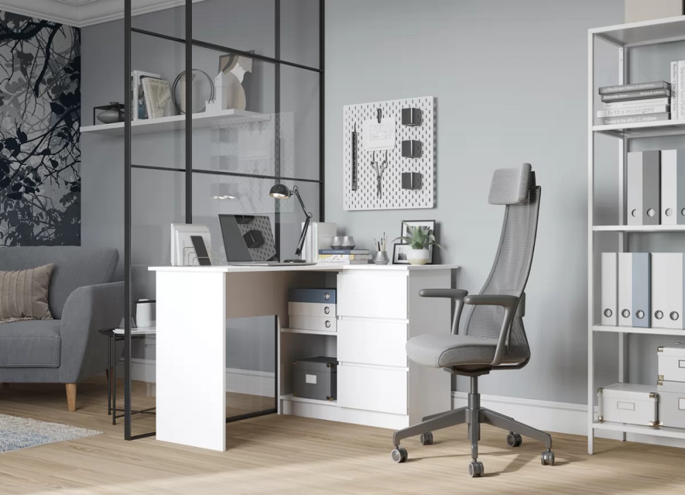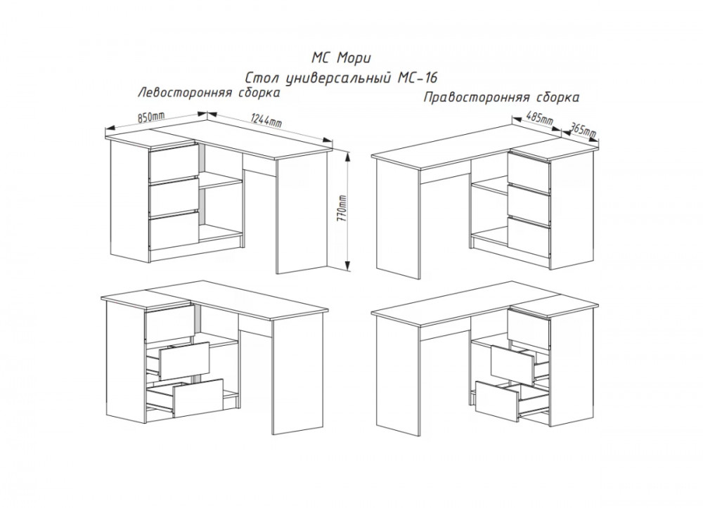 МОРИ МС-16 Стол угловой с 3мя ящ., УНИ (ш1244*г850*в770мм), ЛДСП белый (МП/3) в Тюмени