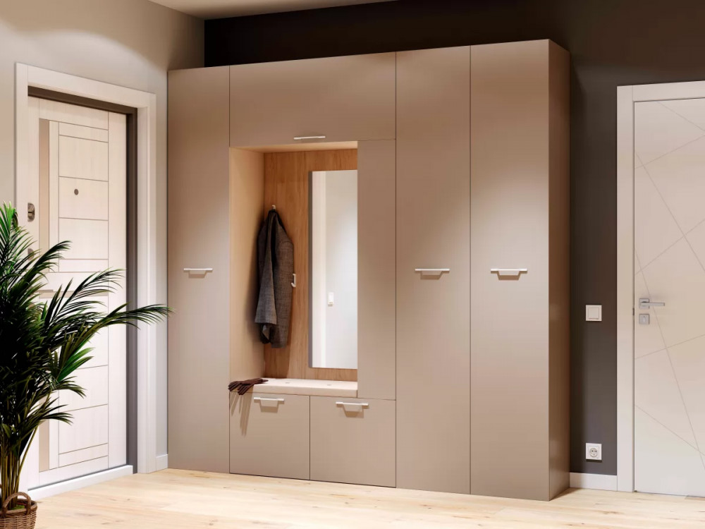 Верхняя полка модуля имеет встроенный газлифт и позволит разместить объемный чемодан. Вертикальный ряд полок выполнен на правую сторону, при желании можно распахнуть створку, прикрывающую ряд. Прочные крючки и ручки в форме скобы выполнены из белого матового металла. Все петли - плавного закрывания.