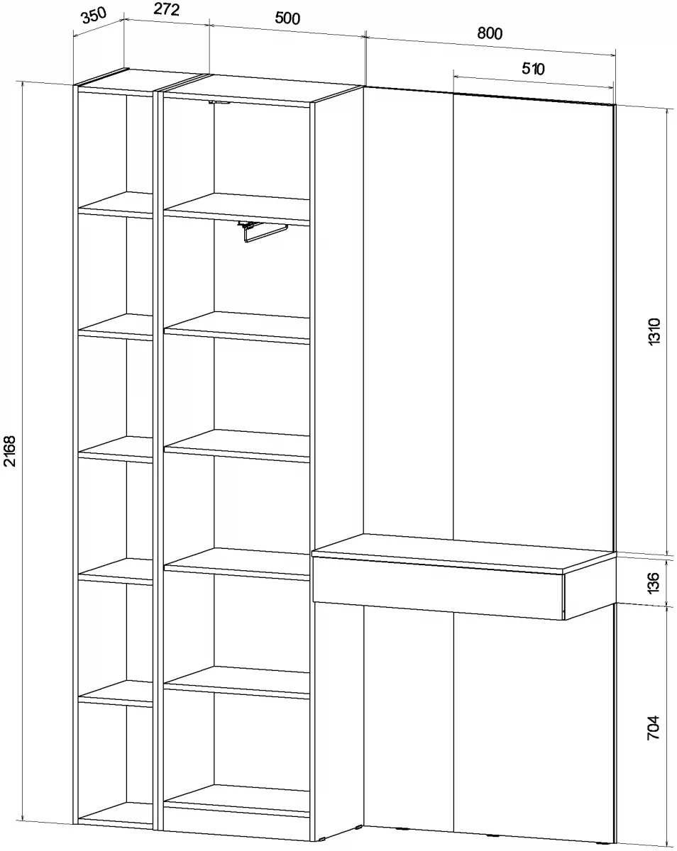 - Габариты: 1572 (ширина) х 350 (глубина) х 2168 (высота) мм.