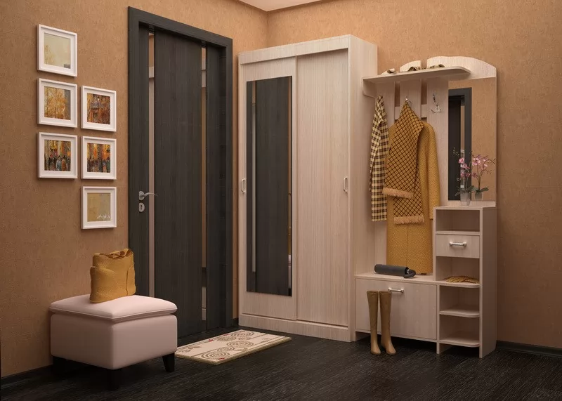 Состоит из: полок, вешалки с крючками для одежды и сумок, обувницы, открытых полок, зеркала, полки для головных уборов, выдвижного ящика. Сборка универсальная.