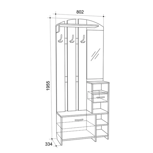 «Мила» создана для Вашей прихожей – Вы можете повесить одежду и сумку на металлические крючки, шляпки положить на полку сверху, нужные мелочи – в выдвижной ящик. На открытых полках можно разместить зонты, перчатки и шарфы. Есть зеркало и обувница.