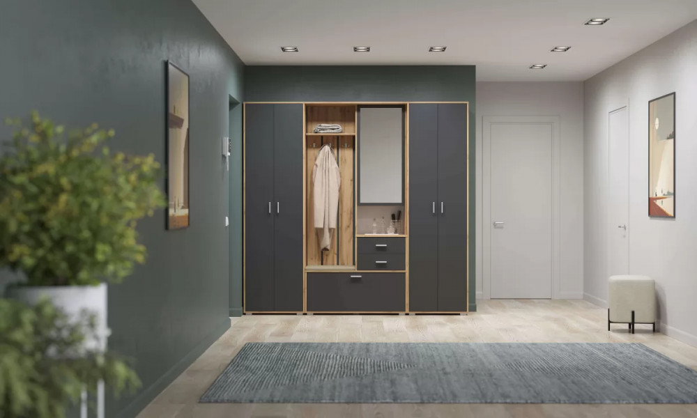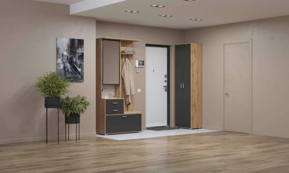 Шкаф для прихожей 65.08 Антре (с зеркалом) (ЛДСП (дуб вотан / диамант серый / ДВПО: белый / ткань: велюр Forward 910 (крем) в Тюмени