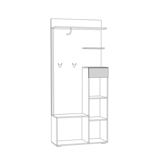 Мини-прихожая "Лайн" №10.16 включает в себя две тумбы с полками и выдвижным ящиком, крючки для одежды, штангу для шарфов или вешалок-плечиков и антресольную полку для головных уборов.