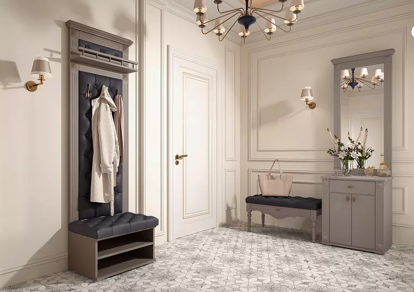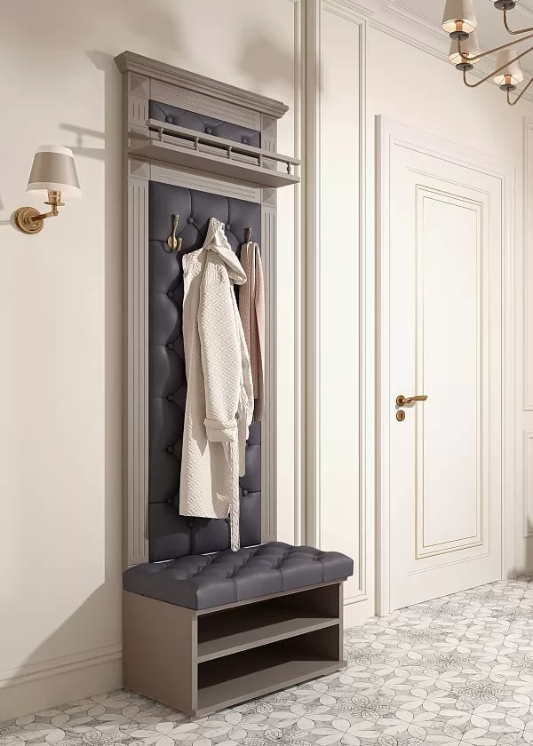 Элементы декора: Декоративный карниз из натурального массива, полка с декоративной балюстрадой, декоративные утяжки на вешалке и сиденье, декоративные фрезерованные планки