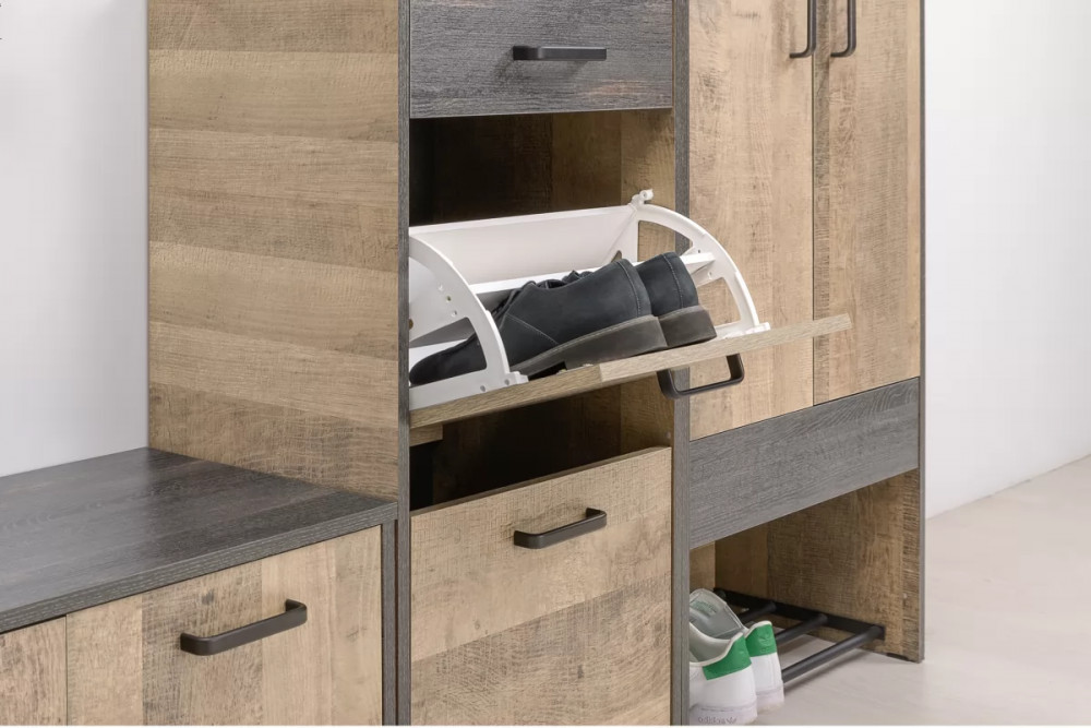 Скрытые направляющие и четырёхшарнирные петли оснащены доводчиками, что обеспечивают повышенный комфорт и надёжность. Металлические опоры делают эту мебель надёжной, аутентичной и функциональной. Лицевая фурнитура с тем же покрытием придаёт мебели индустриальную эстетику. Съёмная металлическая подставка для обуви значительно упрощает уборку.